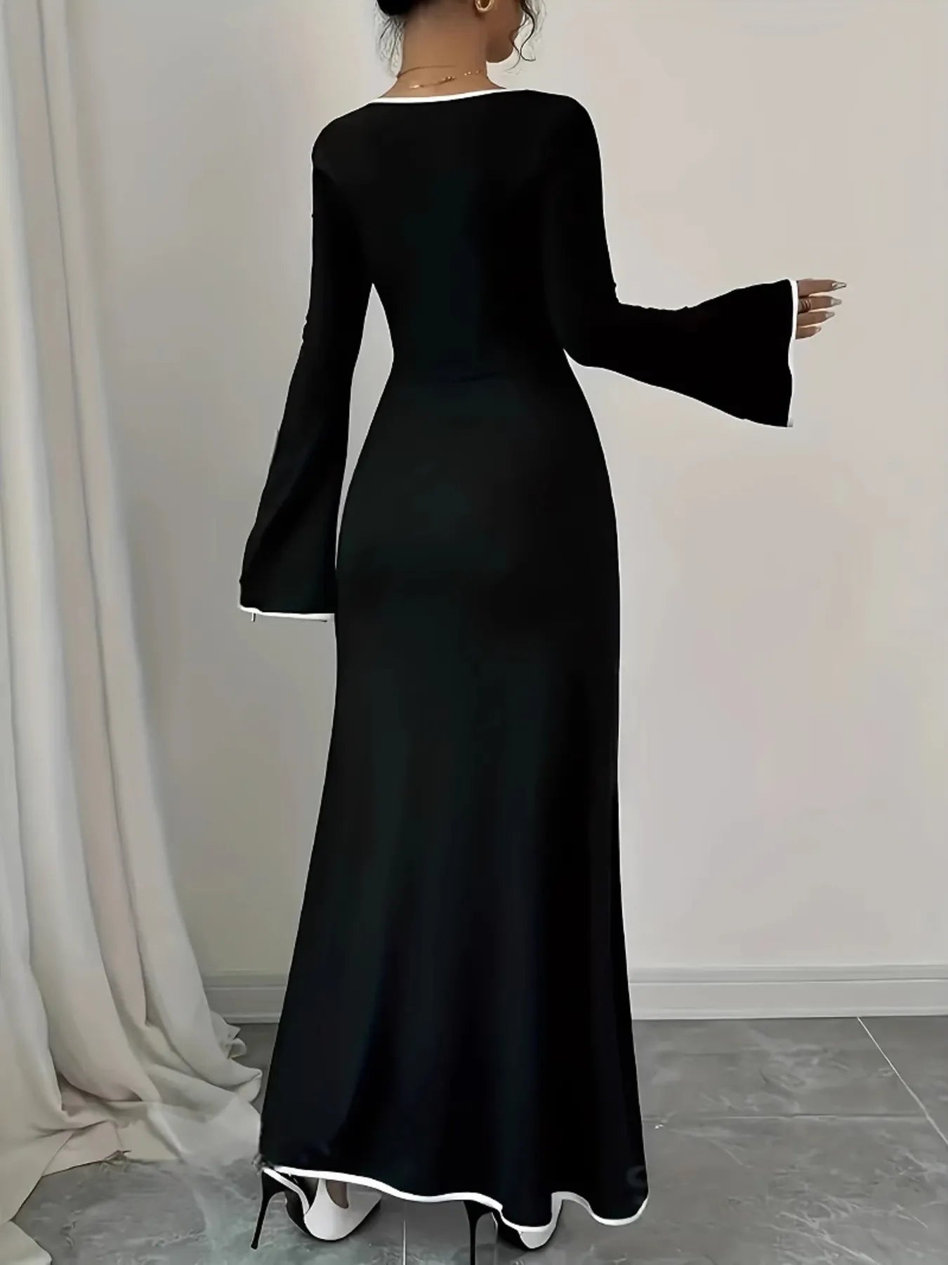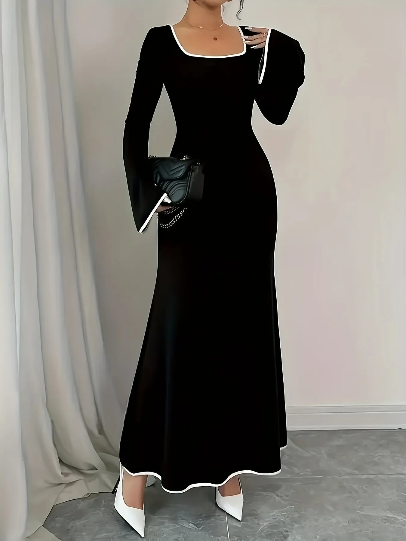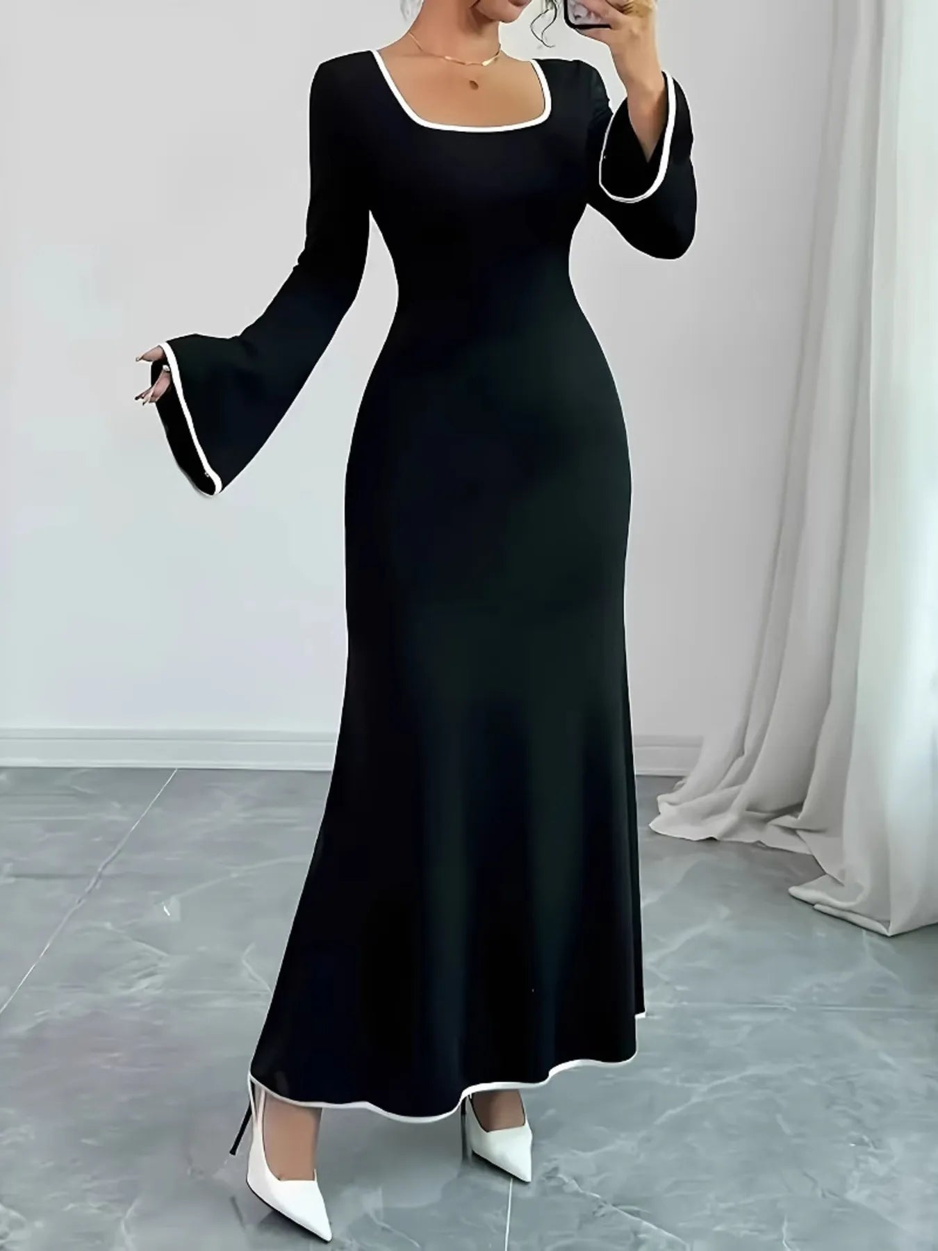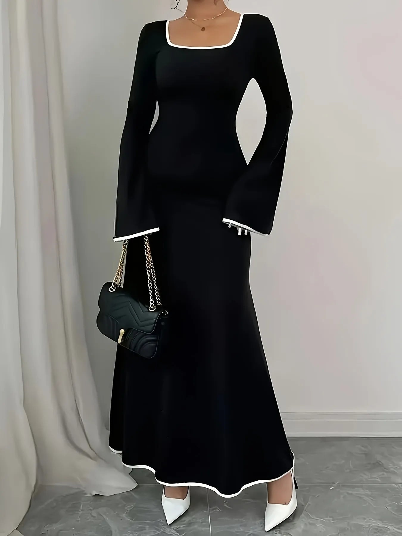 Plus Size Contrast Trim Square Neck Long Sleeve Maxi Dress